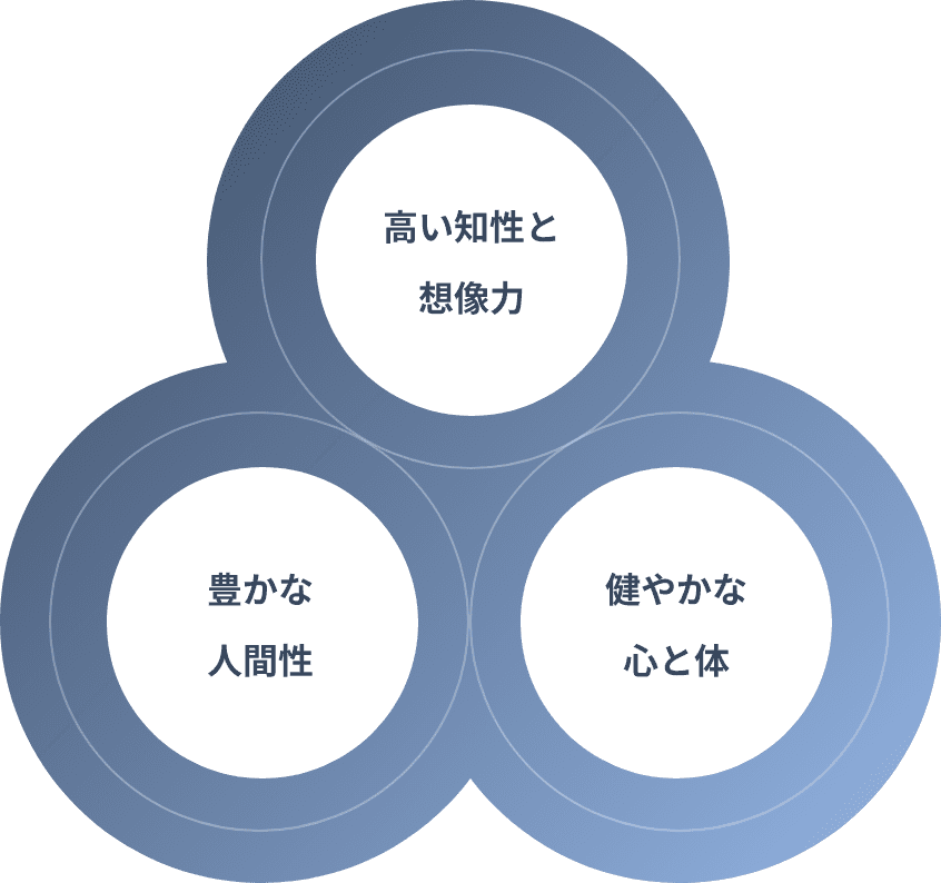 本校では、成長していく生徒一人ひとりを、バランスの取れた強くたくましい人材に育てていきたいという願いのもと、“高い知性と創造性”を身につけ、“豊かな人間性”を育て、“健やかな心と体”を育成するという3つの要素を大事にした指導を行っています。