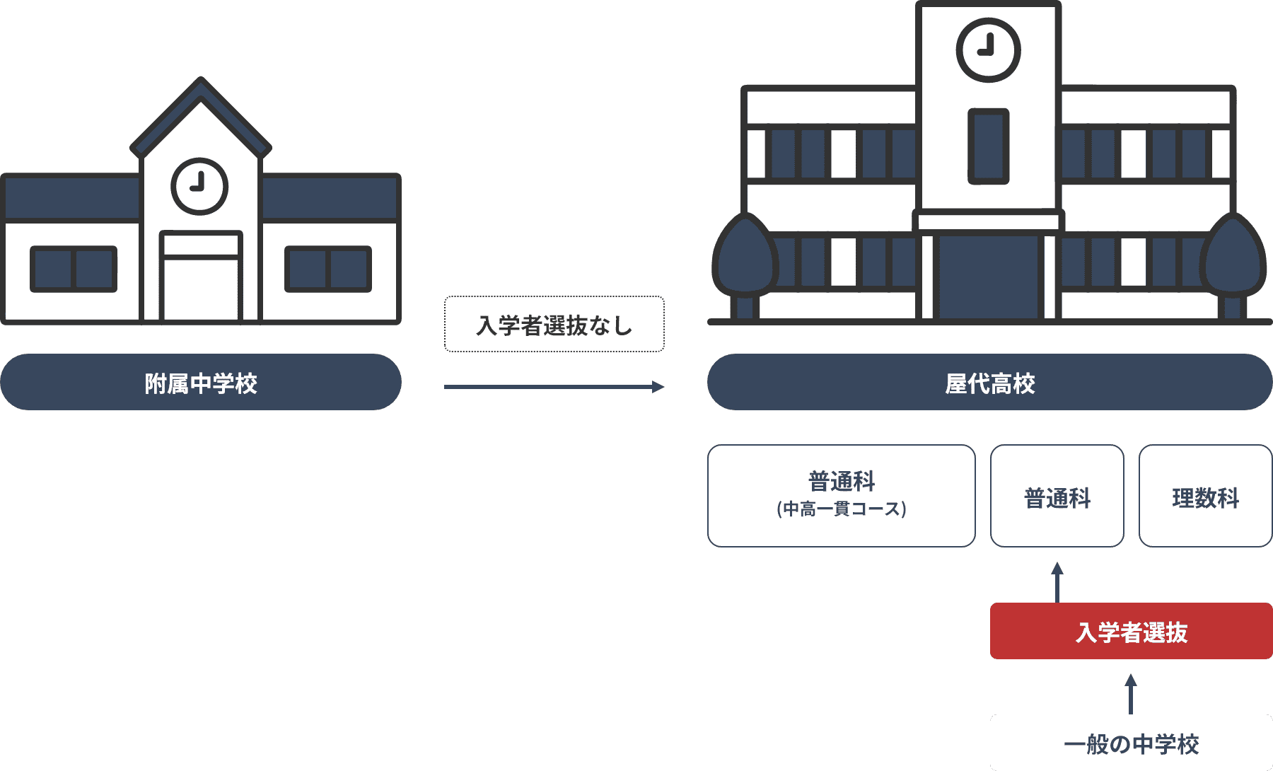 入学者は、入学者選抜(適性検査)により決まります。附属中学校入学後は、3年間の学習活動ののち、無選抜で屋代高等学校普通科へ進学します。つまり本校は“屋代高等学校の生徒になるために学び、活動する中学校”です。